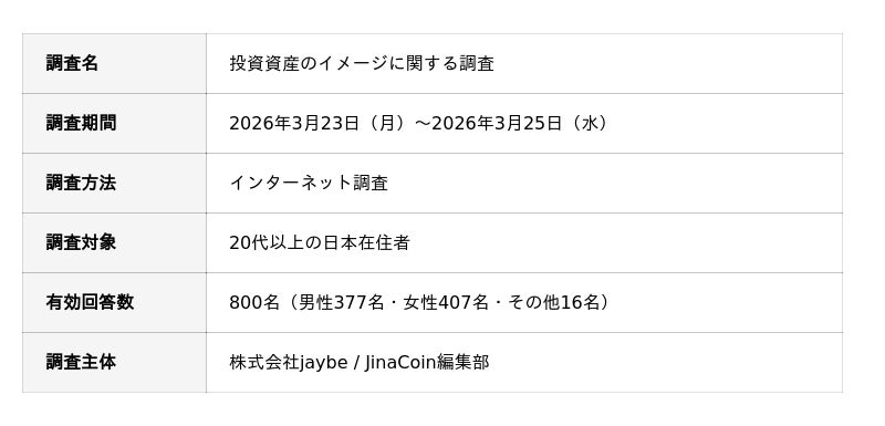 株式会社jaybe(本社:香川県高松市、代表取締役:水澤 誉往)が運営する暗号資産(仮想通貨)ニュースメディア「JinaCoin」(https://jinacoin.ne.jp/)は、20代以上の日本在住者800名を対象に、各投資資産のイメージに関するインターネット調査を実施しました。