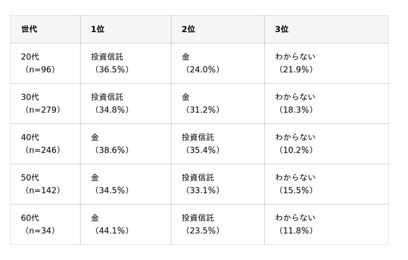 世代別にみると、20代・30代では「投資信託」が1位であったのに対し、40代以降は「金」が1位となるなど、年齢層によって「守り」と捉える資産に違いがみられました。