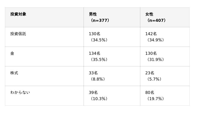 また、女性は「わからない」という回答が19.7%と、男性(10.3%)の約2倍に達している点が特徴的です。一方で、株式については男性(8.8%)が女性(5.7%)を上回る結果となりました。