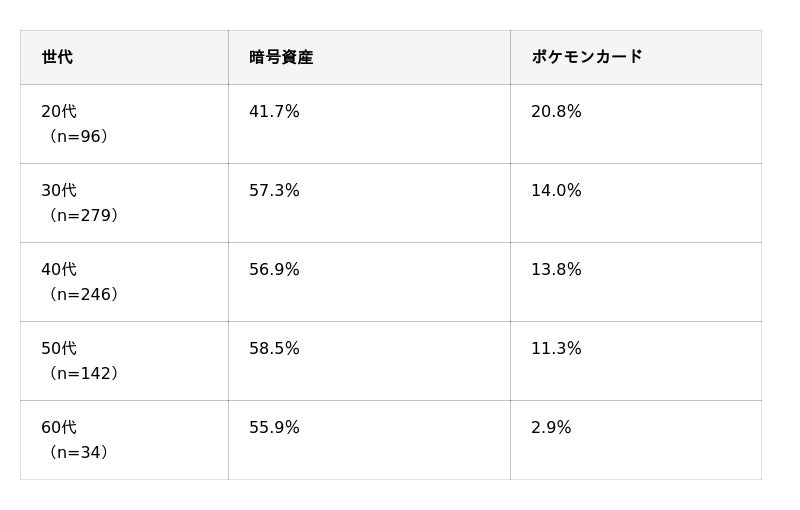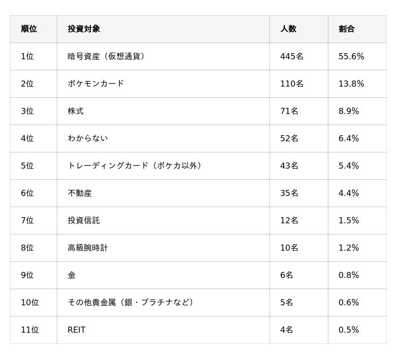 2位の「ポケモンカード」は13.8%で、1位の暗号資産の約4分の1にとどまりました。3位には「株式」(8.9%)がランクインしました。
