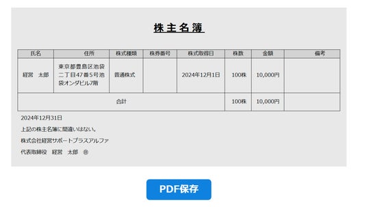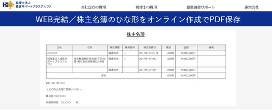 「WEB完結/株主名簿のひな形をオンライン作成でPDF保存」ツール:https://keiei-support-plus-a.com/zeirishi-hiyou/kabunushi_meibo-hinagata/