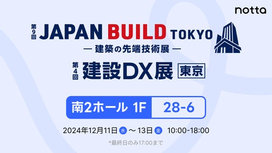 Notta株式会社(本社:東京都渋谷区、代表取締役:Ryan Zhang)は、2024年12月11日(水)から13日(金)まで、東京ビッグサイトにて開催される「第9回 JAPAN BUILD TOKYO内 第4回建設DX展【東京】」に出展いたします。
