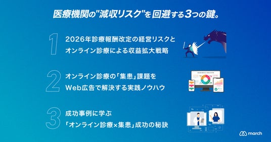 LINEを活用した集患と継続収益まで自動化するオールインワン医療DX「march」を展開する株式会社Wrusty(本社:東京都渋谷区、代表取締役:上田 遼)と、マーケティング・広告運用など幅広くサポートしているリードプラス株式会社(本社:東京都世田谷区、代表取締役:堀 裕)が、全国の医療機関を対象に、無料オンラインセミナー『【備えろ!2026年改定】 "減収リスク"を回避する3つの鍵。「オンライン診療」「効率化」「広域集患」』を2025年12月17日に開催いたします。本セミナーでは、2026年の診療報酬改定において、診療所報酬の適正化(大幅な減収リスク)や医療DXへの対応義務化など、クリニック経営の根幹を揺るがす大きな変化に備え、経営危機を乗り越え、安定的な増収を実現する戦略を具体的に解説します。また、収益の「分母」を拡大するための「オンライン診療」と、その最大の課題である「集患」をWeb広告で解決する実践ノウハウですが詰まった内容となっております。