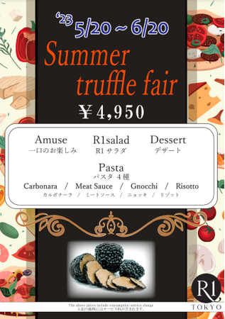 六本木のR1Tokyo Bar&Restaurantでは、5月20日から6月20日まで期間限定で、ディナータイムに大変お得な金額(おひとり様4,950円)での贅沢サマートリュフコースを提供いたします。