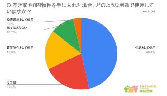 また、「手に入れた0円物件をどのように使っているか」という質問に対し、約半数の13人(46.4%)の人が「住居として使用」と回答。他には「賃貸物件として使用」している人が5人(17.9%)、「投資として使用」が1人(3.6%)となっており、自分が住めない場合にも有効活用している人がいるとわかります。