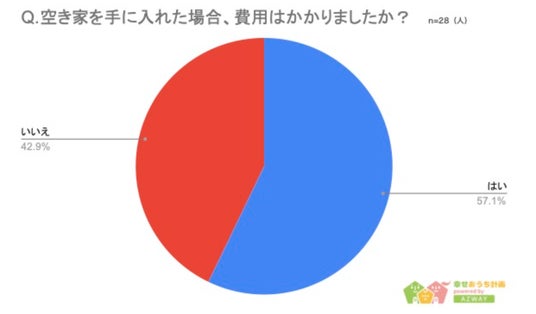 また、0円で物件を手に入れた人のうちリフォームや土地代などに別途費用がかかった人は16人(57.1%)、かからなかった人は12人(42.9%)という結果に。全体の6割弱の人が相続税や家具の処分代など何かしらの費用を支払っており、タダで物件を手に入れてもある程度のお金が必要になる場合が多いことがわかります。