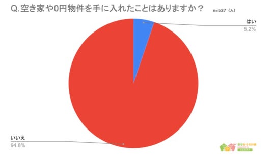 10代から60代以上までの回答者537人に「タダで物件を手に入れたことがあるか」について聞いたところ、「はい」と答えた人は28人という結果になりました。全体の5.2%に当たる人が、何らかの形で物件を0円で手に入れていることがわかります。