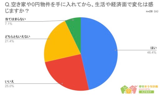 最後に、「空き家や0円物件を手に入れてから生活に変化があったか」について聞いたところ、「はい」と答えた人が13人(46.4%)で、約半数という結果に。「はい」と答えた人の中には、「古い空き家を購入し、夫婦で納得できるリノベーションを行い大変満足している(30代女性)」や「いわくがあるイメージだったものの、空き家制度経由で購入したところ、特に心配はなかった(40代男性)」といった前向きな意見がある一方、「中に残っていた家財を処理するのが大変だった(30代男性)」や「実際に住まないため固定資産税の支払いが大変だった(30代男性)」といったマイナスの意見もありました。