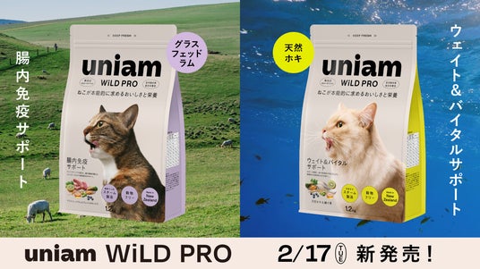 「ねこと生きるを、ユニークに。」をパーパスに掲げ、ねこ特化型ヘルスケアブランドを展開する株式会社uniam(本社:東京都港区、代表取締役CEO:杉本亜衣、以下当社)は、獣医師監修のプレミアムドライフード「WiLD PRO(ワイルドプロ)」シリーズの新ラインナップとして、「グラスフェッドラム&プレバイオティクス(腸内免疫サポート)」および「天然ホキ&緑イ貝(ウェイト&バイタルサポート)」の2種を、2026年2月17日(火)より公式サイトおよび取扱店舗にて順次販売開始いたします。