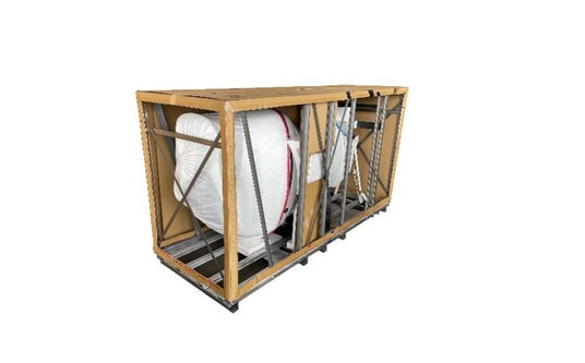 船外機完成品梱包Green Planet フィルムを埃除けカバーとして使用 (梱包確認用に外装段ボールを切り抜いた写真)