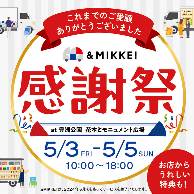 株式会社ShareTomorrow(代表取締役社長:高波英明)の移動商業プラットフォーム事業「&MIKKE!」は、GWの5月3日~5日の3日間、豊洲公園にて&MIKKE!『感謝祭』を開催いたします。本事業が5月末をもってすべて終了となることから、&MIKKE!にとっての最後のマルシェとなります。これまでのご愛顧に感謝を込めて、&MIKKE!にとっての始まりの場所でもある豊洲公園に人気店を集めておもてなしいたします。