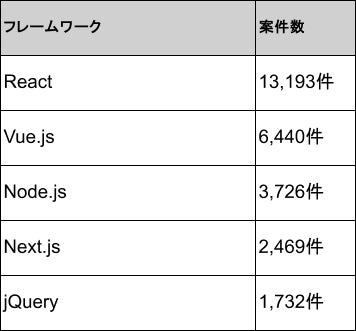 JavaScript系フレームワークの中では、React・Vue.js・Node.jsなどが特に多くの案件数を持ち、市場シェアを拡大し続けています。