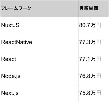 JavaScriptフレームワークの中でNuxtJSが最も高い月額単価を示しており、80.7万円となっています。続いてReactNativeが77.3万円、Reactが77.1万円、Node.jsが76.8万円、Next.jsが75.8万円と並んでいます。