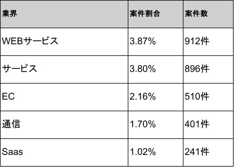 業界別に見ると、Webサービス3.87%、サービス3.80%、EC2.16%、通信1.70%、SaaS1.02%が上位を占め、ユーザー体験を重視するオンラインサービス領域で特に需要が高い状況です。