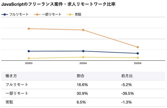 2025年5月時点でのJavaScriptフリーランス案件・求人のリモートワーク比率は、フルリモートが16.6%、一部リモートが30.9%、常駐が6.5%です。