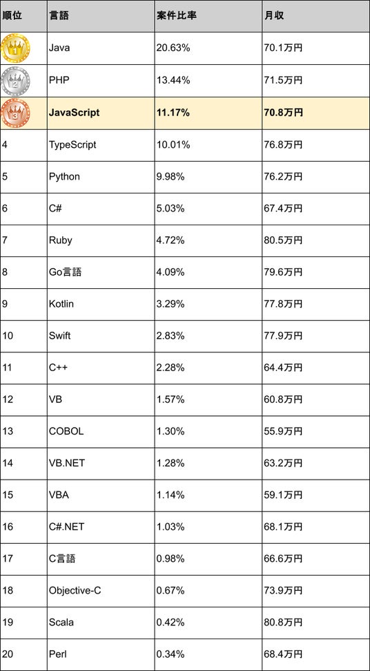 JavaScriptの案件は市場全体の11.17%を占めており、案件数ランキングでは3位に位置しています。Java(20.64%)とPHP(13.50%)に続く高いシェアで、フロントエンド開発をはじめ、Node.jsを用いたバックエンドやモバイルアプリ開発など幅広い領域で需要が拡大しています。