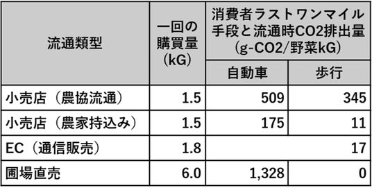 - 圃場での直接販売では、 20km先からガソリン車で買い出しとした場合4.=867g-CO2/kmと高いが実際は、圃場までの手段に大きく依存する。例えば、徒歩で圃場に出向けば0g-CO2/kg。