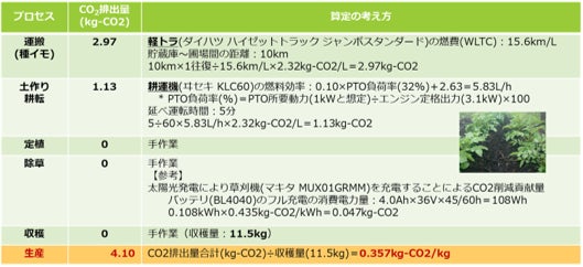 - このうち、ジャガイモの生産工程でのCO2排出量は、357g-CO2/kgであった。一方、慣行農法でのCO2排出量は30g-CO2/kgであり、1kgあたりのCO2排出量は大幅に大きくなった。