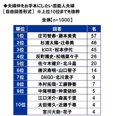 ・夫婦仲をお手本にしたい芸能人夫婦:1位「庄司智春さん・藤本美貴さん」2位「杉浦太陽さん・辻希美さん」