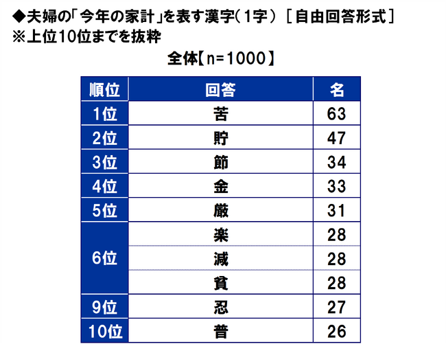 ・夫婦の“今年の家計”を表す漢字 1位「苦」2位「貯」3位「節」