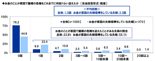 ・「お金が原因で離婚危機を迎えたことがある」24%、お金が原因の夫婦喧嘩をしている夫婦では55%