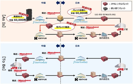 株式会社ファイントゥデイ(本社:東京都港区、代表取締役 社長 兼 CEO:小森哲郎、以下「ファイントゥデイ」)、ケンビューの日本法人であるJNTLコンシューマーヘルス株式会社(本社:東京都渋谷区、代表取締役ヴァイスプレジデント:川村真樹、以下「ケンビュー」)、丸紅ロジスティクス株式会社(本社:東京都千代田区、代表取締役社長:五島洋一郎、以下「丸紅ロジスティクス」)、日本パレットレンタル株式会社(本社:東京都千代田区、代表取締役社長:二村篤志、以下「JPR」)は4社協働で、製品の物流において荷役、輸送、保管等に使用する国内用レンタルパレットを用いた、2荷主の日本・中国間の輸出入マッチングを行い、当該国内用レンタルパレットを海外でも循環利用する「パレットラウンドユース」を開始します。7月から試行運用を行い、安定的なオペレーションを継続できる目途が立ったため、9月より本格運用へ移行します。