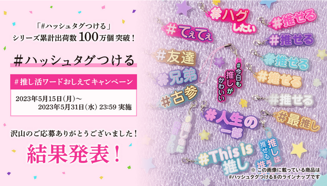 シリーズ累計出荷数 100 万個を突破した人気シリーズ「#ハッシュタグつける」では、2023年5月15日(月)~2023年5月31日(水)に、商品化してほしい推し活ワードを募集する「#ハッシュタグつける #推し活ワードおしえてキャンペーン」を実施しました。皆さまからたくさんのご応募をいただき、誠にありがとうございました。このたび商品化する推し活ワードが以下11作品に決定しました。