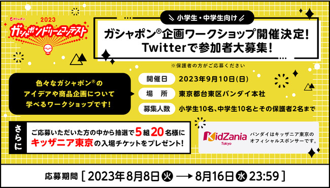 ガシャポン公式Twitterアカウント(@Gashapon_Bandai)をフォローいただき、対象キャンペーンに参加していただいた保護者の方を対象に、抽選で小学生10名様、中学生10名様とその保護者2名様までを東京都台東区にあるバンダイ本社にて開催する「ガシャポン(R)企画ワークショップ」へご招待します。
