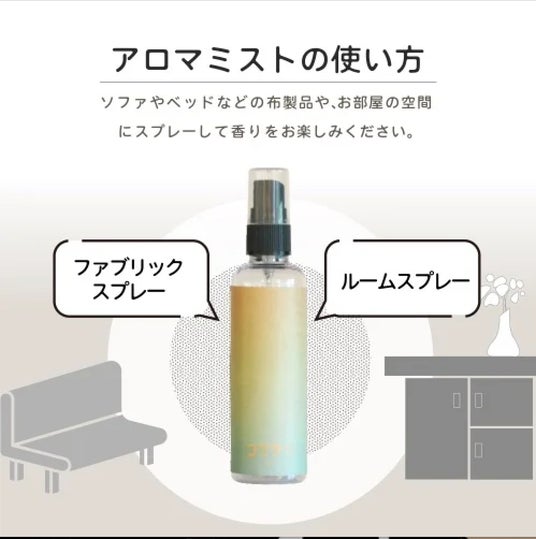 布製品や衣類、ルームスプレーとして使用可能。対象物から30cmほど離してスプレーし、シミや色落ちが発生しないことを確認してから使用してください。火気付近での使用は避け、高温・多湿・直射日光を避けて保管してください。詳しい使用上の注意は、商品パッケージをご参照ください。