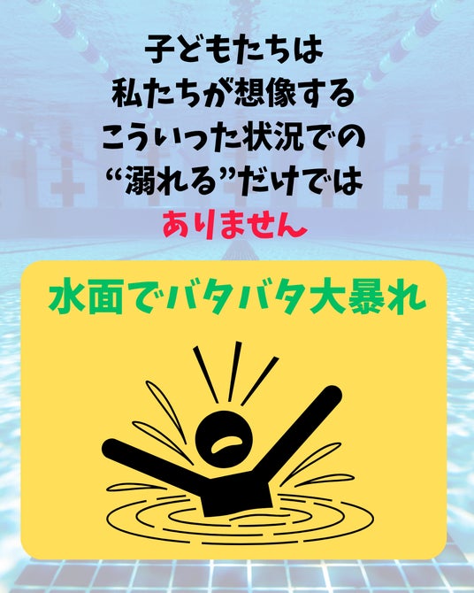 保護者にとって、溺れる=水面で暴れる・水面で大声を出して騒ぐという想像に至りやすい溺水。しかしながら、溺水する子どもたちは静かに底で沈んでいくことのほうが多く、“気が付いたら姿が見当たらない”という状況に陥ります。