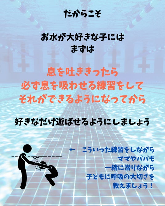 特に、ハンディキャップ児・健常児に問わず、息苦しいが分からない、息が苦しい時にどうしていいのか分からないという様子が見てとれることがあります。また、水遊びが大好きな子にとっては、息ができない苦しいことよりも、ずっと潜っていたい気持ちが勝ることにより溺水に結びつくこともあります。