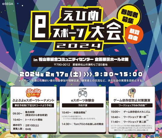 年齢や性別、障がい者の垣根なく、また現地に来られない方向けにオンラインでもご参加いただけます。ゲームタイトルは「ぷよぷよeスポーツ」を採用。トーナメント形式で進行し、決勝戦は体育館で実施します。実況・解説をぷよぷよのプロゲーマーTom選手とぴぽにあ選手が行います。実際のeスポーツ大会の臨場感・緊張感を現地で味わいましょう!