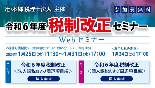辻・本郷 税理士法人(本社:東京都新宿区、理事長:徳田孝司)は、2024年1月25日(木)より、「令和6年度 税制改正セミナー」を開催いたします。自由民主党・公明党から12月14日(木)に「令和6年度税制改正大綱」が公表されました。公表された大綱より主な改正・見直し項目をまとめ、法人向けパート、個人向けパートに分けて、わかりやすく解説します。