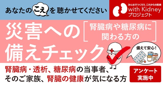 腎臓病や糖尿病をもつ方、そのご家族、腎臓の健康が気になる方などを対象に、防災への備えや意識を、50項目でセルフチェックできる形式のアンケートを実施します。