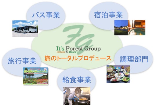 株式会社フォレストは宿泊業だけではなく平成22年にバス事業・旅行業の許可・登録を取得しました。バス旅行と宿泊を一社で一括して行うことで、魅力あふれるツアーをリーズナブルなお値段にてご提供することが可能となり、皆様に大変ご好評をいただいております。また、平成25年に学校給食を手掛ける株式会社富士フードサービス、平成26年に魚類卸売業の株式会社魚浦商店、平成27年にホテルサンルート栃木を運営する株式会社フォレストフォーシーズン、平成29年にこころをなでる静寂 みやこを運営する株式会社ニューみやこ、令和4年に湯の宿 白山菖蒲亭を運営する有限会社白山菖蒲亭の株式を取得、令和6年11月にフォレストリゾート初のフォレストグランピングリゾート稜「ITU」(栃木県那須郡那須町)の運営を開始し、食事提供部門と宿泊部門のさらなる強化も進めております。「宿泊」「飲食」「バス」の各事業が伴うことで、観光旅行~ビジネス宿泊~教育旅行等すべてを網羅し、皆様の旅をトータルプロデュースさせていただく所存です。