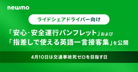 newmo株式会社(本社:東京都港区、代表取締役:青柳直樹、以下newmo)は、2025年4月10日の「交通事故死ゼロを目指す日」にあわせ、ライドシェアドライバーの安全運転意識と接客品質の向上を目的としたパンフレット「安心安全なライドシェア運行のために」および「英語一言接客集」を公開いたします。
