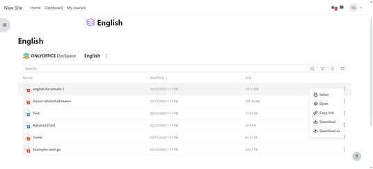 コースに埋め込まれた活動として追加すると、DocSpaceのパブリックルームがコースページに表示され、Moodleユーザーは自分の役割とアクセスレベルに応じた操作を行うことができます。