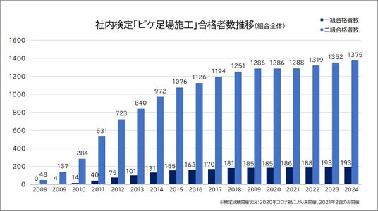 社内検定「ビケ足場施工」は、とび職などの国家技能検定では測れない、ビケ足場に特化した施工に関する技能をはじめ、足場の設計や部材積算まで、現場で求められる職務に関する幅広い技能を測る検定試験です。安全かつ高品質で安定した足場の設計・施工サービスを提供するため、施工スタッフの技能を保証することを目的に設立いたしました。足場業界では唯一、厚生労働省の認定を受けた社内検定制度です。2011年に認定を受けて以来14年間にわたり実施を続けており、組合員全体の受検者数はのべ3,878人(一級739人、二級3,139人)、合格者数はのべ1,568人(一級193人、二級1,375人)となっています。(2024年11月時点)