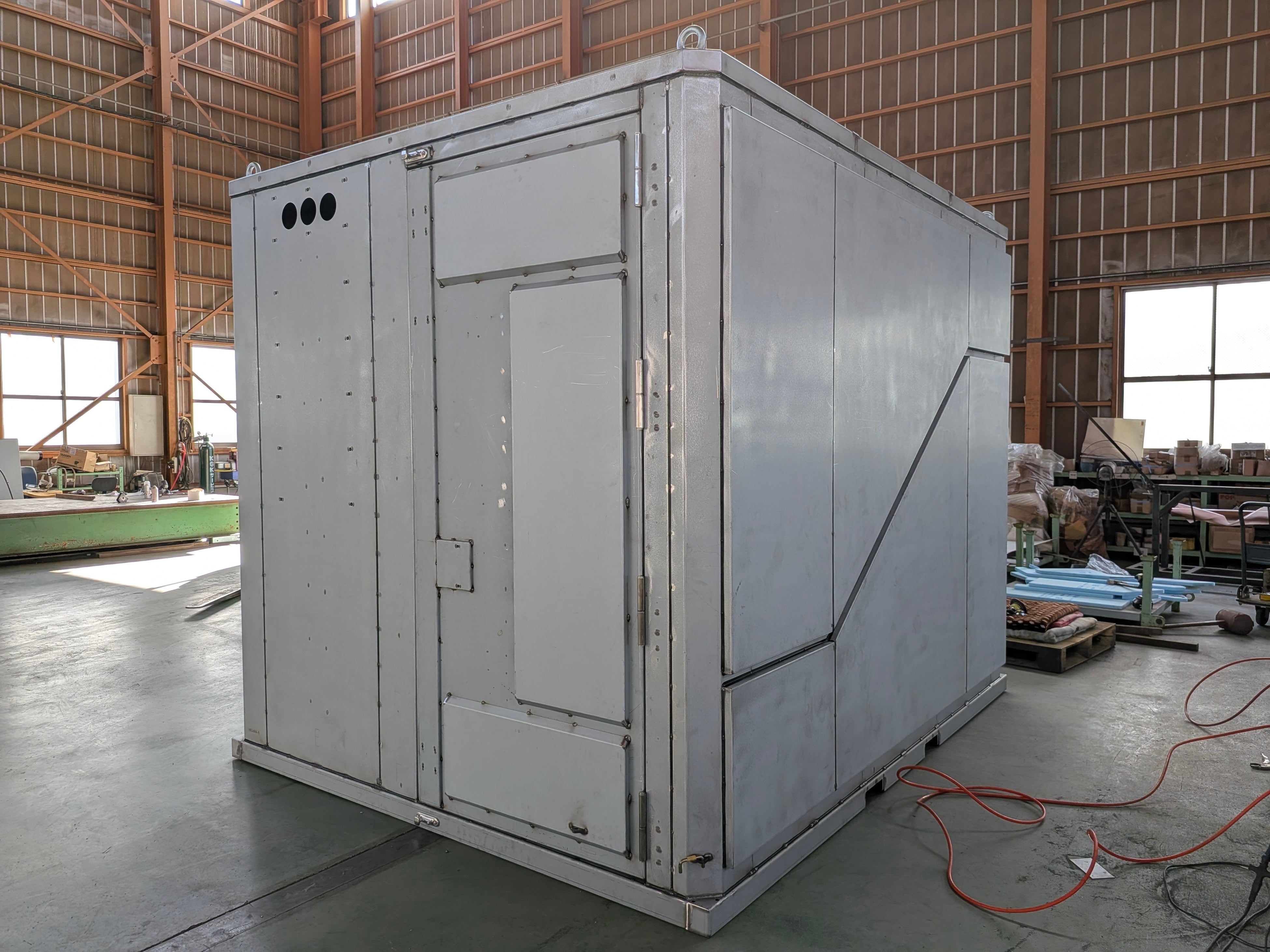 弊社では設計・レーザー加工・曲げ加工・溶接加工・塗装に至るまで一貫した生産体制を構築し、高品質かつ信頼性の高い製品づくりを実現しています。さらに2025年からは自社製品のシェルターにも施工している高耐久・高純度ポリウレア塗装設備を導入し、防災・耐久性能に優れた製品の開発・提供に努めております。