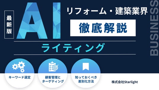 株式会社Starlight(本社:東京都豊島区、代表取締役社長:黒田 真乃介、以下「当社」)は、建築・リフォーム業界の皆様を対象に「建築・リフォーム業界向け AIライティングの教科書」を公開いたしました。本レポートは建築・リフォーム業界の皆さまが手間を減らしながらAIを活用し、SEO対策を行うガイドラインとなる情報を一冊に集約しています。