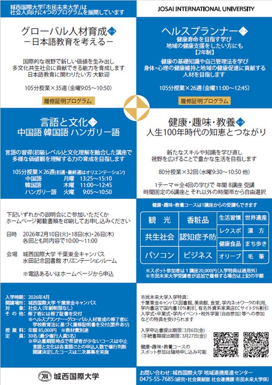 城西国際大学「市民未来大学」は、一般市民向け教育プログラムです。前身となる「シニア・ウェルネス大学」が城西国際大学創立15周年を記念して開設されて以降、教養・健康・学術的取り組みなど大学が有する知的資源を分かりやすく提供することによって、地域住民の方に自ら健康を培い、生きがいをもって社会参加していただくことを目的としています。