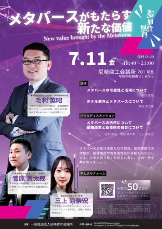一般社団法人尼崎青年会議所(理事長:小原卓也 所在地:兵庫県尼崎市昭和通3丁目96番地 尼崎商工会議所ビル5F)では、2030年までに市場規模5,000億ドルに達すると予想されているメタバースについて、専門家をお招きし講演会を開催いたします。