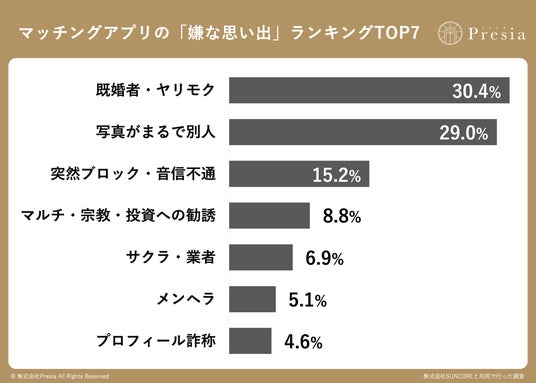 「マッチングアプリで遭遇した『嫌な思い出』で、最も印象的なものを教えてください」と質問したところ、第1位は「既婚者・ヤリモク(30.4%)」でした。