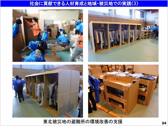 建築学部の学生がその場で段ボールを切って組み立てて机や仕切りを作成し避難所の環境を改善