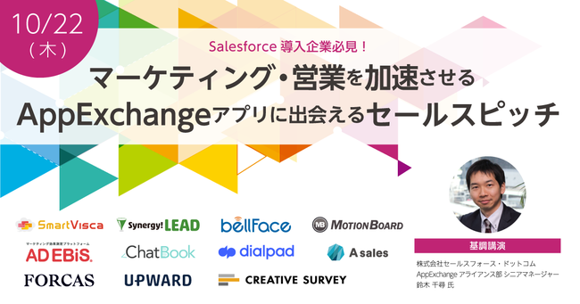 当社は“テクノロジーで仕事の「あり方」を変える”というミッションを掲げており、Salesforceを導入されているお客様が適切にAppExchangeアプリを活用して業績を向上させられることを願っており、この度各AppExchangeパートナー様との協賛で、「マーケティング・営業を加速させるAppExchangeアプリに出会えるセールスピッチ」を開催することとなりました。
