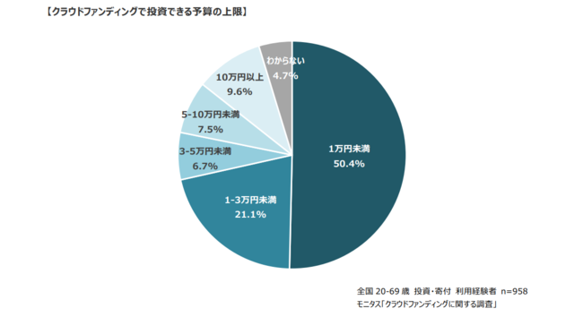 では、投資・寄付をする場合の予算の上限はどれくらいなのでしょうか。クラウドファンディングで投資・寄付を行ったことのある人に投資・寄付できる予算の上限について聞いたところ、「1万円未満」で50.4%と、半数を占める結果となりました。