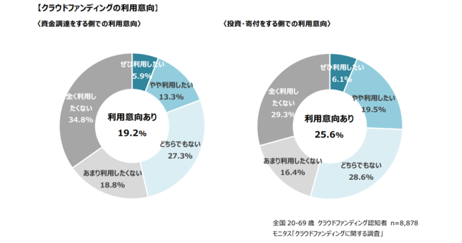 一方で、投資・寄付をする際の利用意向は「利用したいと思う」(6.1%)、「やや利用したいと思う」(19.5%)。利用意向は25.6%。
