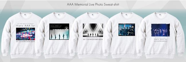 AAAの活動休止前に開催された15周年記念ドームツアー「AAA DOME TOUR 15th ANNIVERSARY -thanx AAA lot-」のライヴフォトを使った、Tシャツ、スウェットシャツ、トートバッグ、ダイカットクッションを販売しました。ライヴフォトは5種類。お好きなアイテムと写真を組み合わせ、さらに日付や会場名・お名前などテキスト入力も可能です。