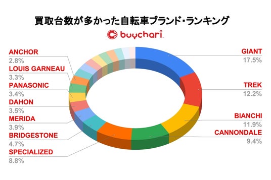 バイチャリ株式会社(本社:埼玉県さいたま市 / 代表取締役:家本賢太郎)は、当社が運営する自転車買取販売専門店「buychari(バイチャリ)」の全店舗および関連する各種買取サービスにおいて、2023年7月~2024年6月に買取させていただいた自転車(ママチャリと呼ばれる一般車は除く)をPOSデータを元に集計し、ブランド別買取数量と買取シェア率のランキングを発表いたします。