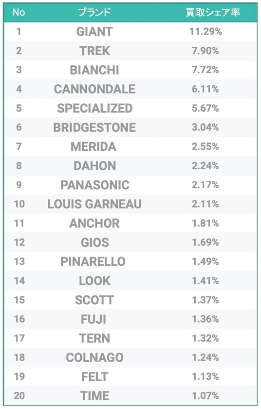 【2023年下半期~2024年上半期 自転車ブランド別買取数量&シェア率ランキング TOP20】
